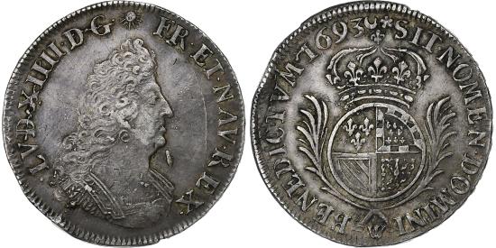| | France, Louis XIV, 1/2 Ecu de Flandre aux palmes, 1693, Lille, Silver | | | Bust of Louis XIV right, wearing a cuirass decorated with a Gorgon's head., Crowned and round coat of arms, divided into 1 of France, 2 of modern Burgundy, 3 of ancient Burgundy, 4 of Navarre, surrounded by two palms., A magnificent example of the rare issues of Louis XIV struck for the Flanders region, highly sought after by collectors, with a superb cabinet patina. These coins are reformations of circulating ecus and divisional coins, but this example has been very well reformed, so it is not possible to determine which type of 1/2 ecu has been reformed., LVD• XIIII• D• G• (Sun) FR• ET• NAV• REX, SIT• NOMEN• DOMINI• - BENEDICTVM• 1693 | | FEATURES |