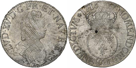 | | France, Louis XV, Ecu Vertugadin, 1716, Paris, Silver, , Gadoury:317 | | | Juvenile bust of Louis XV right, draped and cuirassed., Round coat of arms of France., New flan. | | FEATURES |
