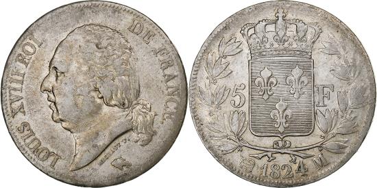 | | France, Louis XVIII, 5 Francs, 1824, Toulouse, Silver, , Gadoury:614 | | | Head of Louis XVIII on left, legend on right and left, French coat-of-arm surmounted by a crown and dividing the value in two, framed by two olive branches attached by a ribbon, date and mint letter below. | | FEATURES |