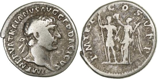 | | Trajan, Denarius, 103-111, Rome, Silver, , RIC:85 | | | Bust of Trajan, laureate, right, Trajan, standing front, holding vertical spear in right hand and parazonium in in left, crowned by Victory , draped on right, standing left, holding palm in left, IMP NERVA TRAIANVS AVG GER DACICVS, P M TR P COS V P P | | FEATURES |