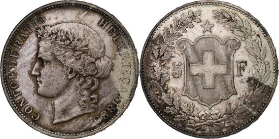 | | Switzerland, 5 Francs, Helvetia, 1889, Bern, Silver, , KM:34 | | | Head of Helvetia on the left, hair tied back in a low bun with a few loose strands, crowned with gentian, caption and year around it., Swiss coat of arms cutting the value in two, surmounted by a star and framed by two branches, one of oak and the other of laurel, tied by a ribbon surmounting the mint. | | FEATURES |