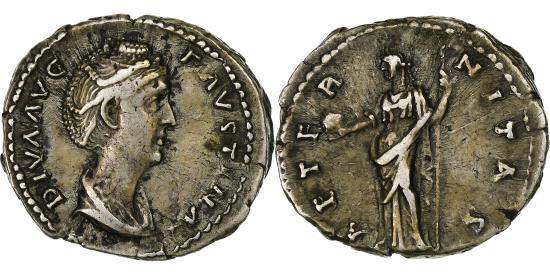 | | Diva Faustina I, Denarius, 141, Rome, Silver, , RIC:350Aa | | | Bust of Faustina I, draped, right with hair elaborately waved and coiled on top, Providentia, draped, standing left, holding globe in extended right hand and vertical sceptre in left, DIVA AVG FAVSTINA, AETERNITAS | | FEATURES |
