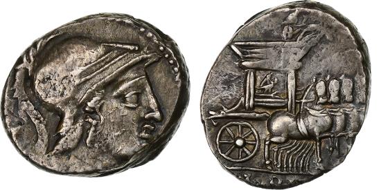 | | Rubria, Denarius, 87 BC, Rome, Silver, | | | L. Rubrius Dossenus, Bust of Minerva, right, wearing Corinthian helmet and aegis., Triumphal quadriga (with eagle on thunderbolt on side-panel), right; above, Victory in biga with outspread wings., L. Rubrius Dossenus, [DOS], [L·RVBRI] | | FEATURES |