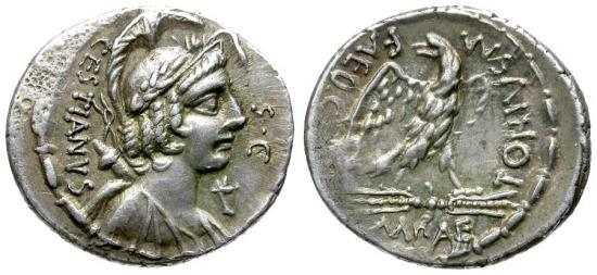 57 BC - Roman Republic. M. Plaetorius M.f. Cestianus AR Denarius / Eagle
