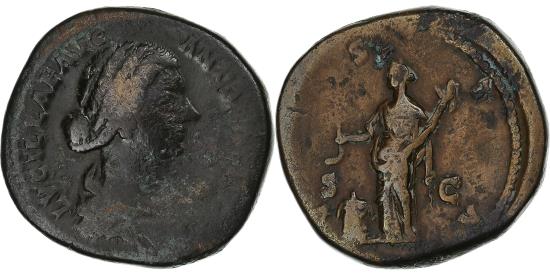 | | Lucilia, Sestertius, 164-169, Rome, Bronze, , RIC:1779 | | | Bust of Lucilla, hair waved and fastened in a low chignon at back of head, draped, right, Vesta, veiled, draped, standing left by altar, holding simpulum in right hand and palladium in left hand, LVCILLAE AVG ANTONINI AVG F, VESTA S C | | FEATURES |