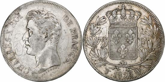 | | France, Charles X, 5 Francs, 1826, Lille, Silver, , Gadoury:643 | | | Head of Charles X on left, legend on right and left, French coat-of-arm surmounted by a crown and dividing the value in two, framed by two olive branches attached by a ribbon, date and mint letter below. | | FEATURES |