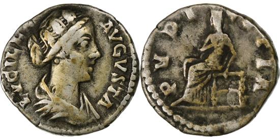 | | Lucilla, Denarius, 164-180, Rome, Silver, , RIC:781 | | | Bust of Lucilla, bare-headed, hair waved and fastened in a bun on back of head, draped, right, Pudicitia, veiled, draped, seated left on low seat, with right hand on breast, LVCILLA AVGVSTA, PVDICITIA | | FEATURES |