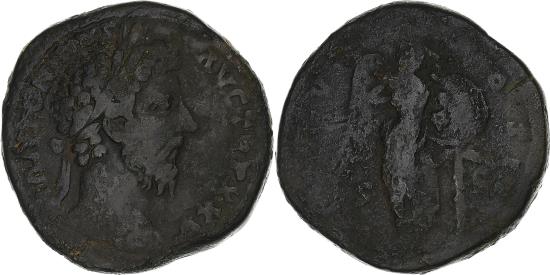 | | Marcus Aurelius, Sestertius, 170-171, Rome, Bronze, , RIC:1001 | | | Head of Marcus Aurelius, laureate, right, Victory, winged, naked to waist, standing front, head right, setting on palm-tree right, shield inscribed VIC GER, M ANTONINVS AVG TR P XXV, IMP VI COS III S C | | FEATURES |