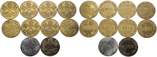 REUS. Conjunto de 10 jetones de latón de la Obra de San Pedro de Reus (Cru.L. 2041), diferentes estados de conservación. A EXAMINAR.