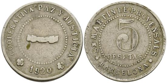 SAN MARTIN DE PROVENSALS (BARCELONA). 5 pesetas. 1920. Barcelona. Cooperativa Paz y Justicia. MBC.