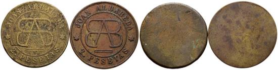 BARCELONA. Conjunto de dos fichas de latón de 2 Pesetas del establecimiento Joan Albareda, diferentes estados de conservación. A EXAMINAR.