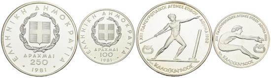 GREECE. Pair of 100 and 250 Drachmas in silver. 1981. Pan-European Games. Uncirculated. TO EXAMINE.