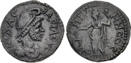 Obverse: Draped bust of King Midas right, wearing Phrygian cap. Reverse: Dikaiosyne standing left, holding scales and scepter.