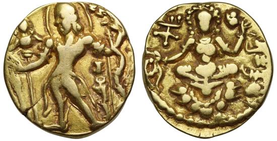 | Gupta Empire, Chandragupta II (c. 375-414), gold Dinar, archer type, type two, lotus reverse, CHANDRA, below arm of king standing left, holding bow and arrow, garuda standard in field, rev. SRI VIKRAMAH, goddess seated on lotus facing holding long-stemmed lotus and riband, 7.58g (BMC 70 ff). Very fine. |