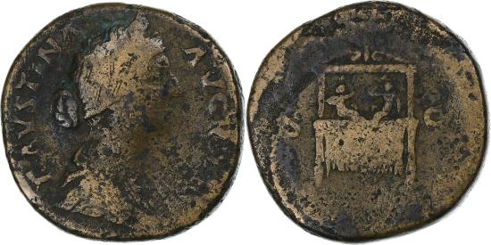 | | Faustina II, Sestertius, 161-176, Rome, Bronze, , RIC:1665 | | | Bust of Faustina II, draped, diademed, hair elaborately waved in nearly vertical lines and fastened in a low chignon at back of head round head, down cheek, curls, right, Throne (pulvinar), draped and ornamented, on which are two baby boys, Commondus and Antoninus, seated face to face, with stars above their heads, FAVSTINA AVGVSTA, SAECVLI FELICIT S C | | FEATURES |