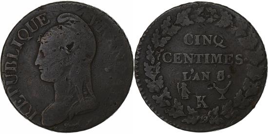 | | France, 5 Centimes, Dupré, An 8/7, Bordeaux, Copper, , Gadoury:126a | | | FEATURES |