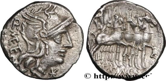 Q. (ME)(TE) en monogramme Tête casquée de Rome à droite ; sous le menton, marque de valeur (XVI)