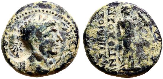 Claudius AE18.5 Assarion. Hierapolis, Phrygia. Apollo w. plectrum & lyre Obv: Laureate head of Claudius to right; behind, uncertain countermark. KΛAYΔIOΣ KAIΣAP. Rev: Apollo standing front, head to right, holding plectrum in his right hand and lyre in his left. ΣYIΛΛIOΣ / ANTIOXOΣ ΓPA - IEPAΠOΛITΩN. RPC I 2969. 41-54 AD. M. Suillios Antiochos, grammateus, 50-54. 5.35g. |