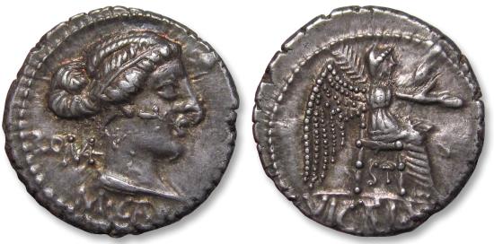AR denarius M. Porcius Cato, Rome mint 89 B.C. - beautifully toned and sharp -