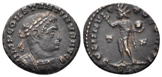 Constantine I 'the Great'. 307-337 AD. AE Follis (3.28g, 18mm). Lugdunum mint. Struck 314/5 AD. Obv.: IMP CONSTANTINVS AVG, laureate and cuirassed bust right. Rev.: SOLI INVICTO COMITI, Sol standing left, holding globe and raising right hand; T - F in fields; PLG in exergue. RIC 17. VF.