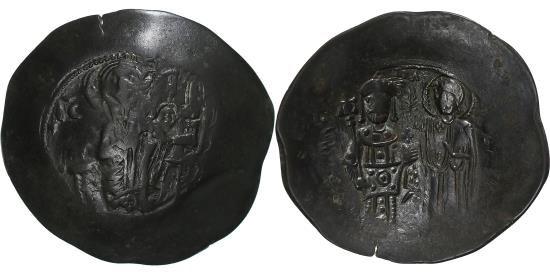 | | Manuel I Comnenus, Aspron trachy, 1143-1180, Constantinople, Billon, | | | Nimbate Christ, bearded, seated facing on throne, wearing pallium and colobium; in left, book of Gospels., The Virgin, nimbate (on right), and Manuel (on left), both standing facing, the Virgin wears pallium annd maphorium, and with Her right hand crowns the emperor, who wears divitsion and chlamys, and holds labarum and globe cruciger. Between their heads, M., IC - XC | | FEATURES |