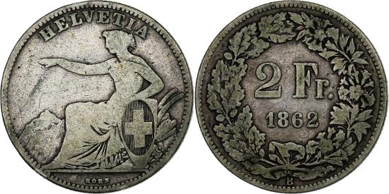 | | Switzerland, 2 Francs, 1862, Bern, Silver, , KM:10a | | | Seated Helvetia, Value, date within wreath, HELVETIA | | FEATURES |