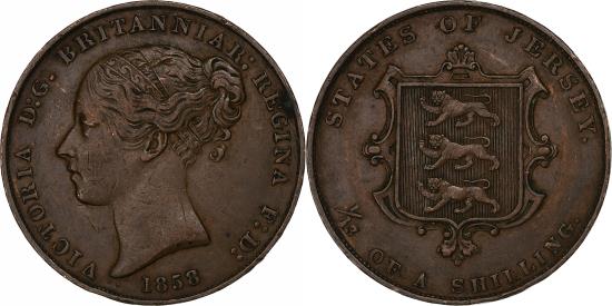 | | Jersey, Victoria, 1/13 Shilling, 1858, Copper, , KM:3 | | | Head left, date below, Ornate shield, VICTORIA D:G: BRITANNIAR:... | | FEATURES |