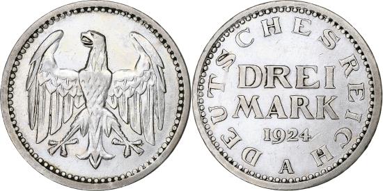 | Germany, Weimar Republic, 3 Mark, 1924, Berlin, Silver, , KM:53 |