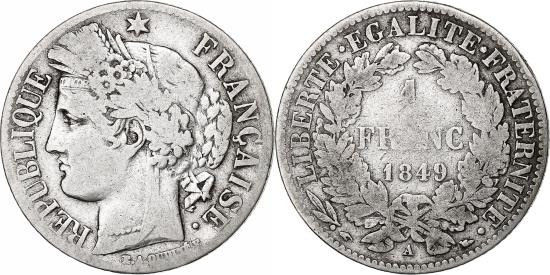 | | France, Franc, Cérès, 1849, Paris, Silver, , Gadoury:457, KM:759.1 | | | Cérès, Liberty head with grain wreath left, Denomination within wreath | | FEATURES |