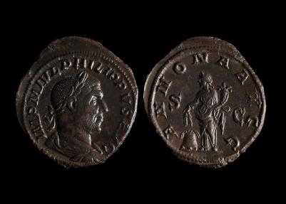 Philip I Ae Sestertius. IMP M IV PHILIPPVS AVG, laureate, draped, and cuirassed bust r. Rev., ANNONA AVGG, S-C across field, Annona standing l., holding cornucopiae and corn-ears over modius. RIC 168a, Cohen 26. 22.49g, 32mm. |