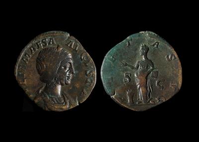 Julia Maesa Ae Sestertius, 218-220 AD. IVLIA MAESA AVGVSTA, diademed, draped bust r. Rev., PIETAS AVG, Pietas standing l., r. hand extended over altar, holding box of perfume in l. RIC 414; BMC 389; Cohen 31. 21.88g, 29mm. |