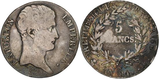 | | France, 5 Francs, Napoléon I, AN 14, Bayonne, Silver, , Gadoury:580 | | | Napoléon I, Monogram below bust, Denomination within wreath | | FEATURES |