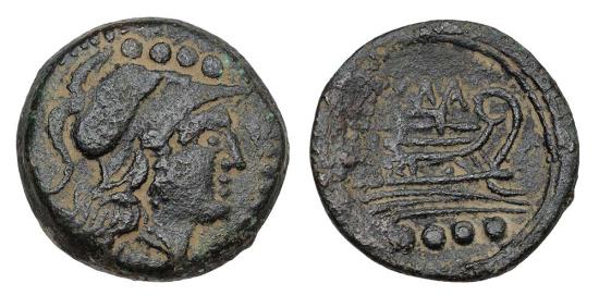 Helmeted head of Minerva right , rev prow of galley right,