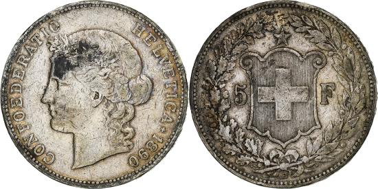 | | Switzerland, 5 Francs, 1890, Bern, Silver, , KM:34 | | | Laureate head left, Shield divides value within wreath, star above, CONFOEDERATIO HELVETICA Karl Schwenzer | | FEATURES |