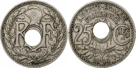 | France, 25 Centimes, Lindauer, 1914, Paris, Off-centre hole, Nickel, |