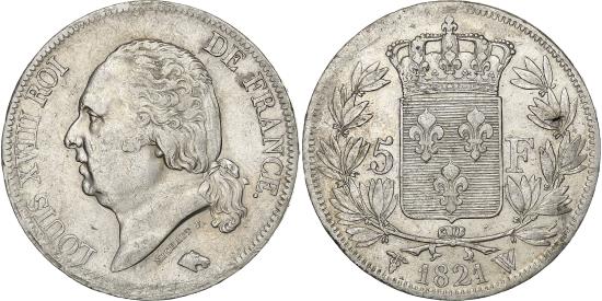 | | France, Louis XVIII, 5 Francs, Louis XVIII, 1821, Lille, Silver, | | | Louis XVIII, Head left, Crowned arms divide denomination within wreath, LOUIS XVIII ROI DE FRANCE., 1821 W. 5 // F, DOMINE SALVUM FAC REGEM | | FEATURES |