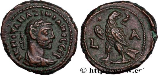 MAXIMIANUS HERCULIUS Auguste I Tétradrachme 286 Alexandrie, Égypte billon Obverse : Buste lauré,drapé et cuirassé de Maximien à droite, vu de trois quarts en arrière (A*2) Reverse : * / L - A Aigle de face, la tête tournée à droite, tenant une couronne dans son bec Commentary : Belle monnaie frappée sur un flan épais et idéalement centré. De hauts reliefs et de jolis détails. Fine usure régulière. Patine marron
