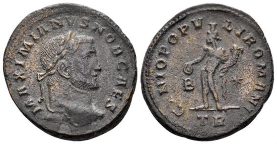Galerius, as Caesar. 293-305 AD. AE Follis (10.64g, 27mm). Treveri mint. Struck 298/9 AD. Obv.: MAXIMIANVS NOB CAES, laureate head right. Rev.: GENIO POPVLI ROMANI / B-*, Genius standing facing, head to left, modius on head, holding patera and cornucopiae; TR in exergue. RIC 357b. VF. |