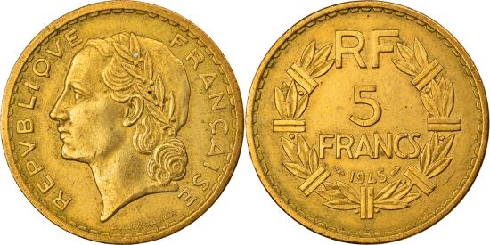 | | Coin, France, Lavrillier, 5 Francs, 1945, Castelsarrasin, | | | Lavrillier, Laureate head left, Denomination above date within sectioned wreath | | FEATURES |