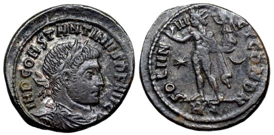 Constantine I A.D. 316 21mm 4.3gm IMP CONSTANTINVS P F AVG; laureate, draped and cuirassed bust right. SOLI INVICT COM D N; Sol rad., stg. L., raising r. hand, Victory on globe in l., chlamys across l. shoulder. in left field ✶, in right crescent. In ex. RT RIC VII Rome 49 This coin was issued during the first civil war with Licinius, that’s why there is the variation of the reverse legend and Sol holding victory. |