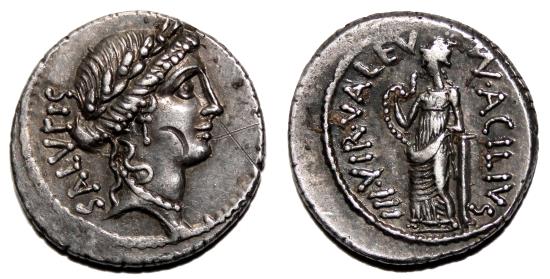 Obverse: SALVTIS. Laureate head of Salus right. Reverse: MN ACILIVS / III VIR VALETV. Valetudo standing left, holding serpent and leaning upon column to right. Very nice denarius, close to EF the obverse, EF- the reverse, conserving complete details on both sides, very bold reliefs and a precious toned silver. Banker mark on obverse. Crawford 442/1a. Rome mint, 49 BC. 3,8 g - 19 mm -------------------------------------------------------------------------------------------------- Visit our site about Numismatics and Archaeology: aeternitas-numismatics.com |