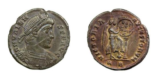 Valens AD 364-378 Silver Miliarense Diademed and cuirassed bust right/Victory standing right foot on globe and inscribing VOT/V/MVLT/X on shield set on cippus Rome RCV19646, 22mm, 4.13g. Scratch on bust, pleasing dark tone. Ex Thruxton Hoard, found in Hampshire and disclaimed. |