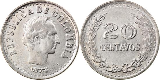 | | Coin, Colombia, 20 Centavos, 1973, , Nickel Clad Steel, KM:246.1 | | | Head right, date below, legend continuous, Denomination within wreath, Varieties exist with and without dots. | | FEATURES |