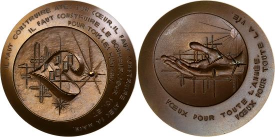 | | France, Medal, Vœux pour toute l'année, 1975, Bronze, Bouyon, | | | In an off-centre, slightly curved circle, in stylised motifs, under a radiant sun, a heart in relief among various graphic ornaments., In an off-centre, slightly domed circle, an enormous vertical hand appears to be held up by scaffolding, with a sun beaming on the horizon., IL FAUT CONSTRUIRE AVEC SON COEUR. IL FAUT CONSTRUIRE AVEC SA MAIN. / IL FAUT CONSTRUIRE LE BONHEUR POUR SOI. ET / POUR TOUS LES HUMAINS.., VOEUX POUR TOUTE L’ANNEE. / VOEUX POUR TOUTE LA VIE. | | FEATURES |