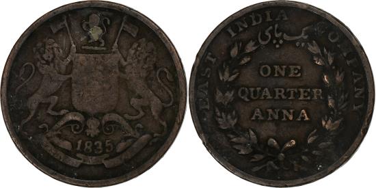 | | INDIA-BRITISH, 1/4 Anna, 1835, Copper, , KM:446.2 | | | Arms with supporters, Value within wreath, Mints: Calcutta: 26.2mm; Mumbai (Bombay): 25.2mm; Madras: 25.5mm. 6 varieties for Madras, 2 varieties for Calcutta. | | FEATURES |