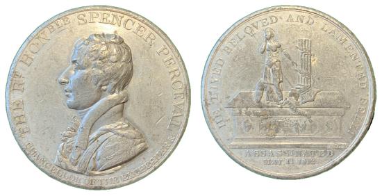 Assassination of Spencer Perceval, 1812, WM medal, by W. Turnpenny for Kempson & Son, 49mm (BHM 729), very fine, some surface marks, minor corrosion on reverse Spencer Perceval (1762-1812), lawyer and politician; Prime Minister of Great Britain, 1809-1812