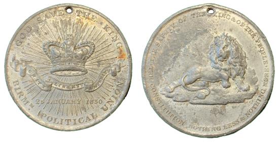 Birmingham Political Union, 1830, WM medal, by C. Jones, 43mm (BHM 1452), some corrosion on reverse, otherwise very fine, rare; holed at top for suspension |
