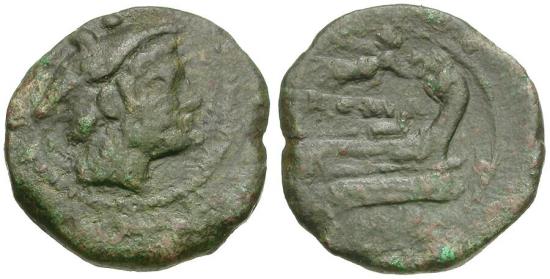 Prow right, Victory flying right / ROMA above, two pellets (value) below