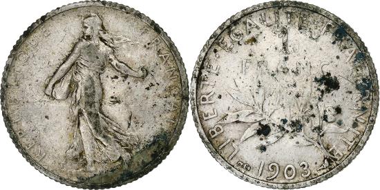 | | France, 1 Franc, Semeuse, 1903, Paris, Silver, , Gadoury:467 | | | Traces of verdigris. | | FEATURES |