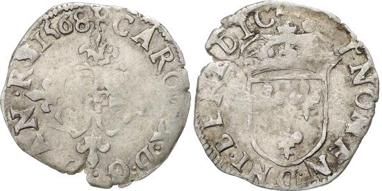 | | France, Charles IX, Sol Parisis, 1568, Angers, 2nd type, Billon, | | | Cross flory formed by four Cs., Crowned arms of France., Extremely rare. Cleaned, minor hairlines or circulation scratches. | | FEATURES |